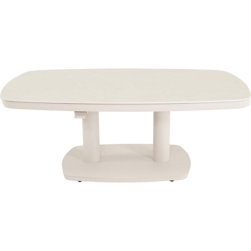 Der Garten Hub-Loungetisch Geneva Crema Danish Oval ist eine stilvolle und praktische Ergänzung für jeden Außenbereich. Die Tischplatte besteht aus 9mm dickem, beige marmoriertem Sintered Stone, einem sehr widerstandsfähigen und pflegeleichten Material, das sowohl robust als auch elegant wirkt. Der Aluminiumrahmen ist matt-beige pulverbeschichtet, was für Langlebigkeit und Schutz gegen Witterungseinflüsse sorgt.